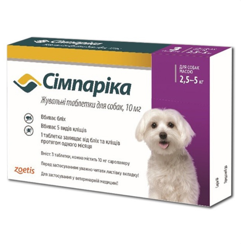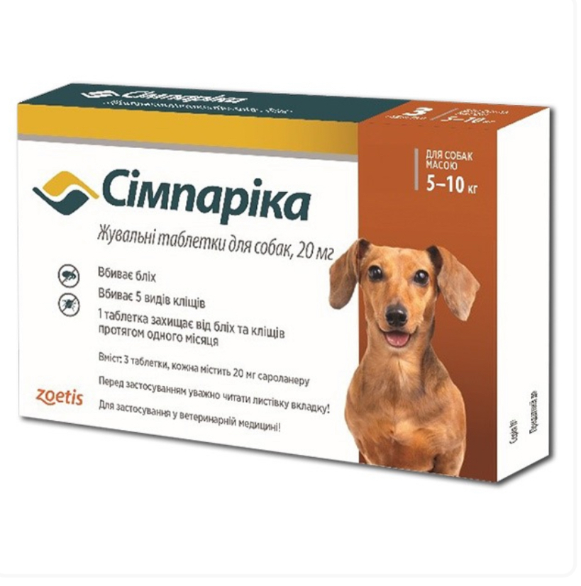 Simparica (Сімпаріка) Таблетки від бліх та кліщів для собак вагою від 5 до 10 кг 335,00 грн. 0,00 грн.