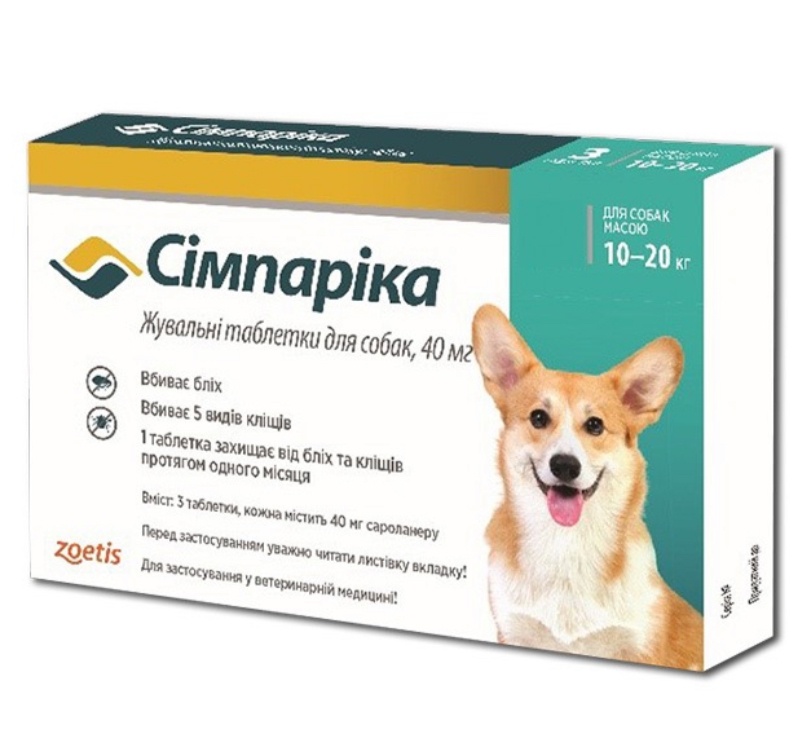 Сімпаріка 10-20 кг 40 мг жувальні таблетки для собак від бліх та кліщів Ціна за 1 табл 357,00 грн. 0,00 грн.