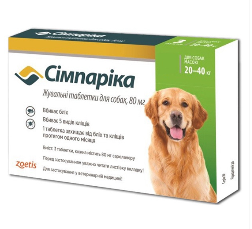 Simparica (Сімпаріка) Таблетки від бліх та кліщів для собак вагою від 20 до 40 кг 385,00 грн. 0,00 грн.