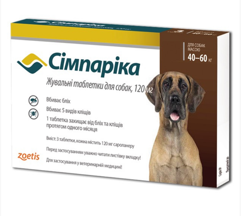 Simparica (Сімпаріка) Таблетки від бліх та кліщів для собак вагою від 40 до 60 кг 432,00 грн. 0,00 грн.