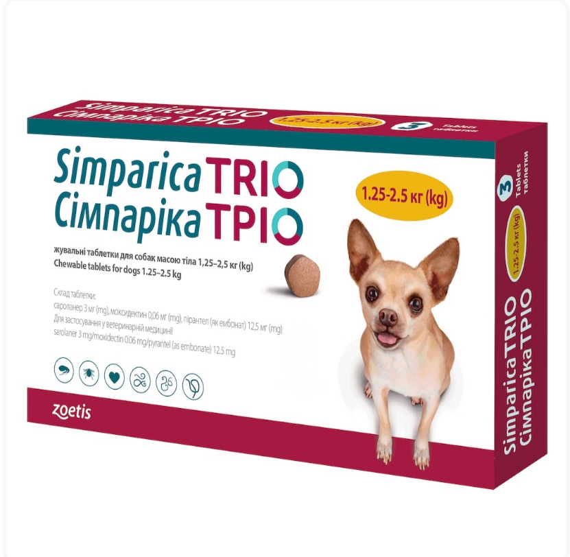 Simparica TRIO - жувальні таблетки від глистів, бліх і кліщів для собак вагою 1,25 кг - 2,5 кг 386,00 грн. 0,00 грн.