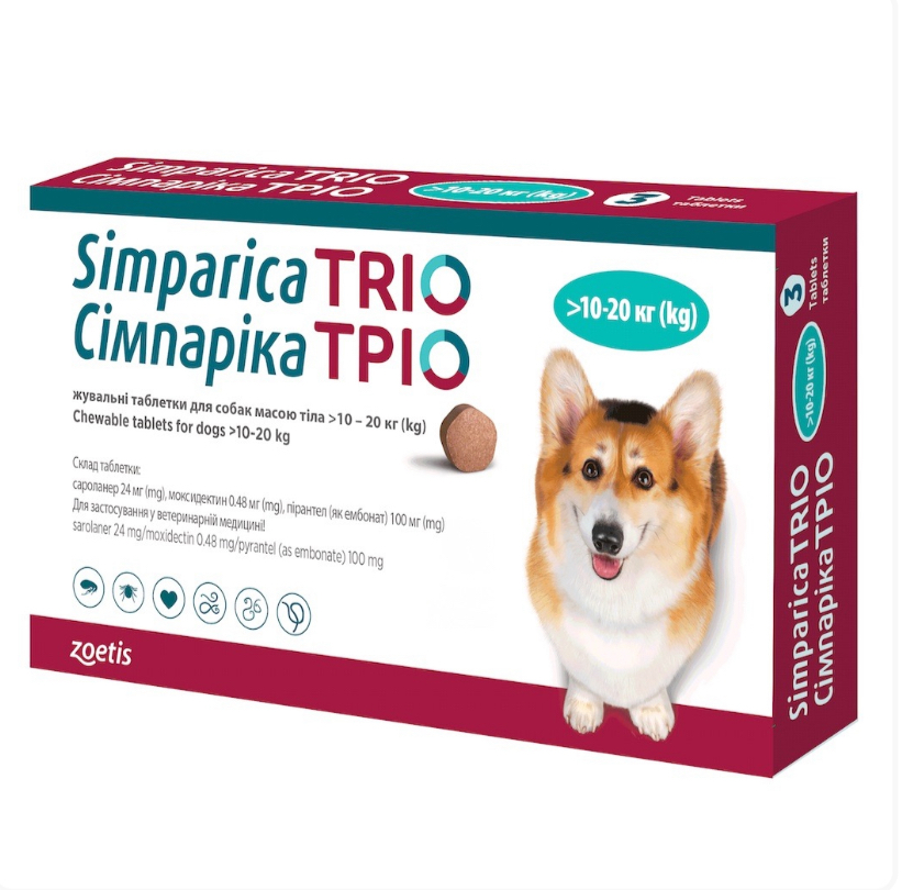 Simparica TRIO - жувальні таблетки від глистів, бліх і кліщів для собак вагою 10 кг - 20 кг 510,00 грн. 0,00 грн.