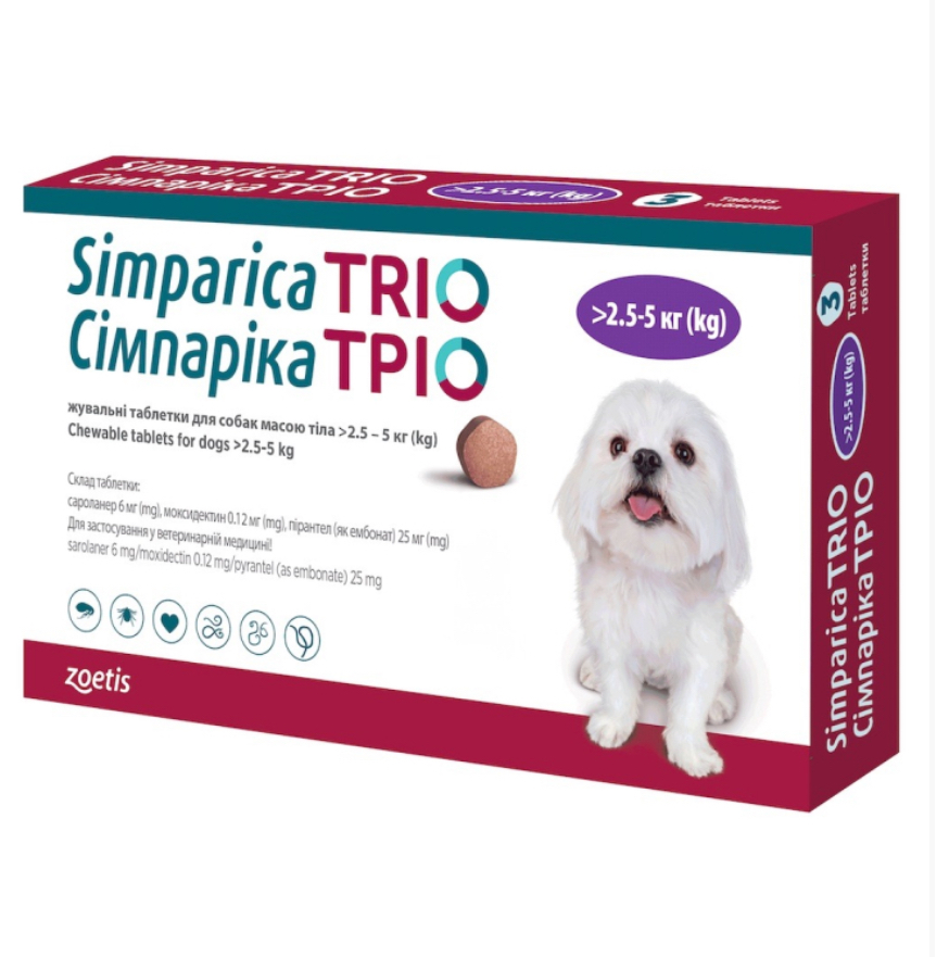 Simparica TRIO - жувальні таблетки від глистів, бліх і кліщів для собак вагою 2,5 кг - 5 кг 410,00 грн. 0,00 грн.